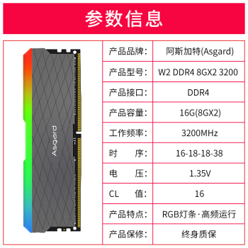 内存>>阿斯加特(Asgard)16GB(8Gx2)套装 3200频率 DDR4 台式机内存条 RGB灯条-兼容各种灯效/W2