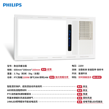 浴霸>>飞利浦(PHILIPS)一厨一卫套装集成吊顶实时数显风暖多功能五合一浴霸暖风机+洁恺二代集成吊顶灯9W 6500K