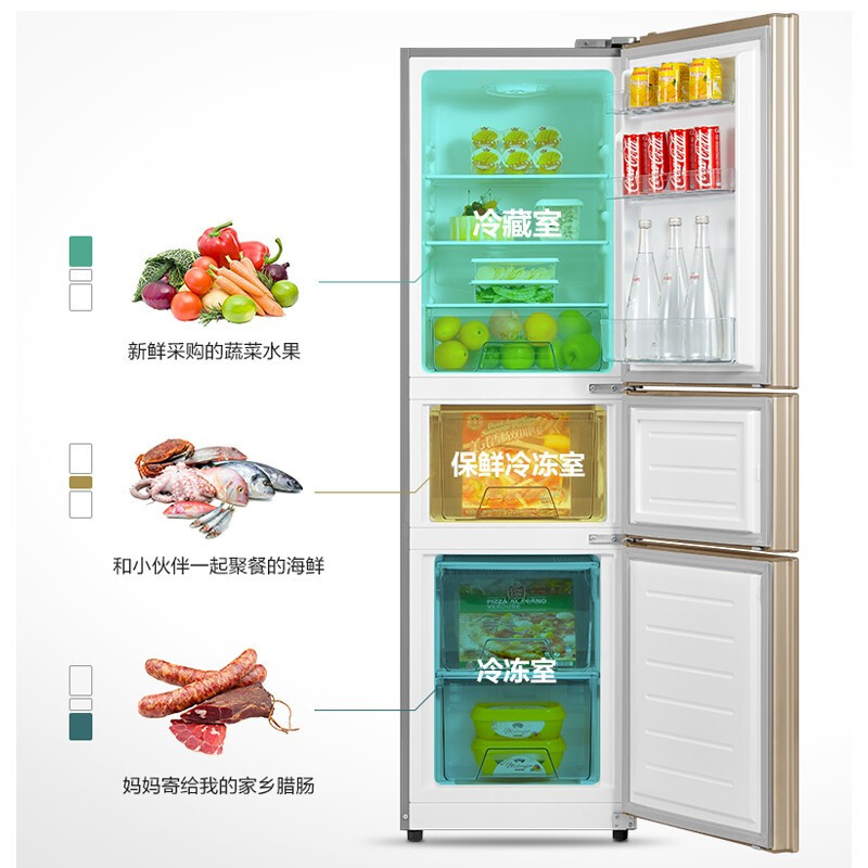 冰箱>>美的(Midea)BCD-210TM(E)三门冰箱直冷家用大容量电冰箱冷藏冷冻节能静音【冰箱/金色】