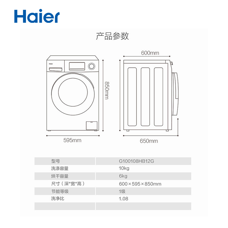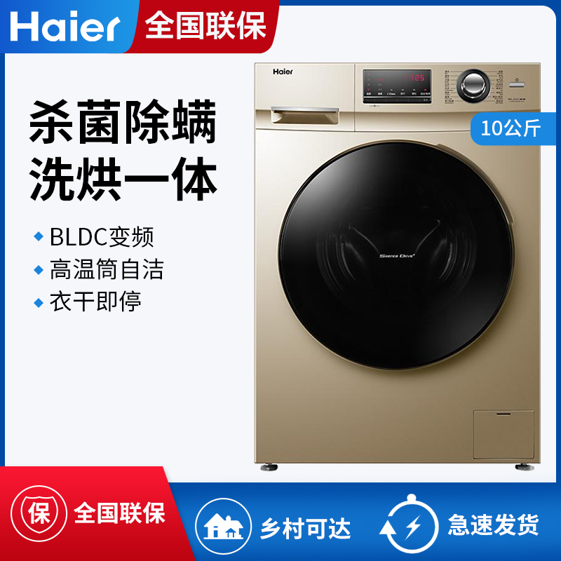 Haier/海尔 G100108HB12G 滚筒洗衣机烘洗干一体机空气洗家用变频除螨10公斤大容量筒自洁【渗锌钢板/金色】