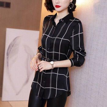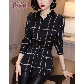 衬衫>>微尚瑶衬衫女2020秋季新款气质格子方领长袖系扣修身衬衣女时尚百搭中长款休闲上衣女7338 格子 请拍正确尺码