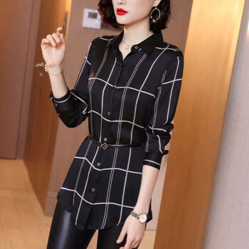 微尚瑶衬衫女2020秋季新款气质格子方领长袖系扣修身衬衣女时尚百搭中长款休闲上衣女7338 格子 请拍正确尺码 |