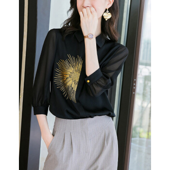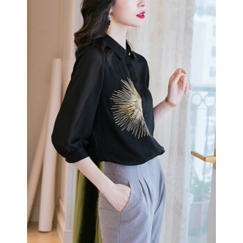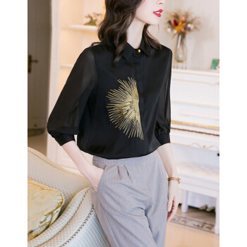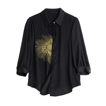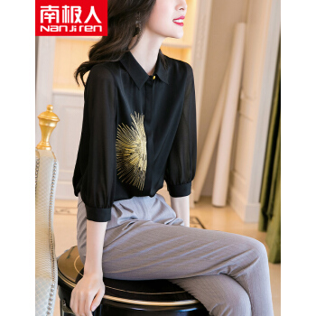 衬衫>>南极人 七分袖衬衫女2020夏季新款女装韩版时尚绣花宽松衬衣气质优雅POLO领上衣 N4-NRE11-9393-黑色 M