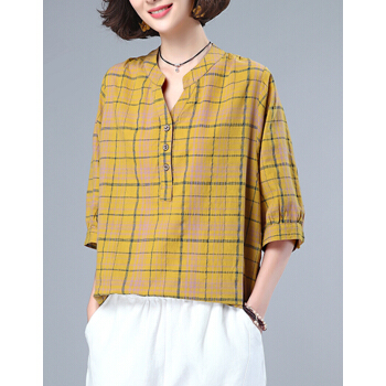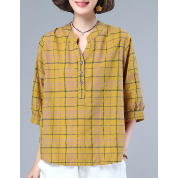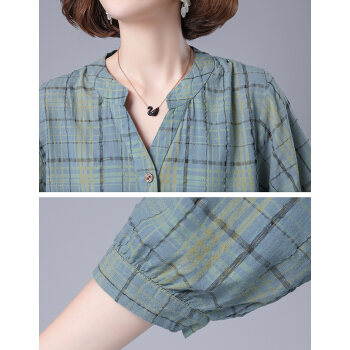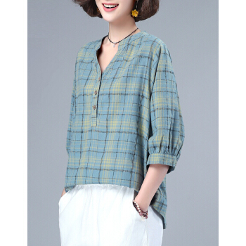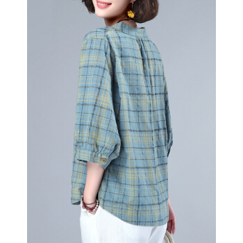 婪澈衬衫女2020女装夏季新款格子宽松薄款衬衣显瘦百搭七分袖上衣女 蓝色 请拍正确尺码