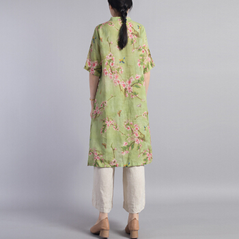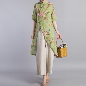 龙芝美 衬衫女2020夏季新款中国风改良汉服不规则复古珠扣苎麻印花立领宽松棉麻衬衣上衣 L1-BH452-8995-上衣图片色 XL |