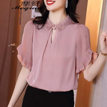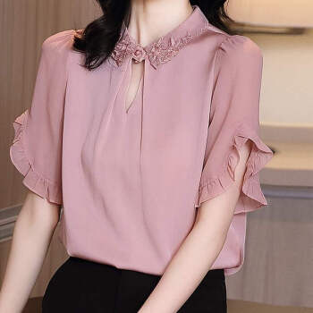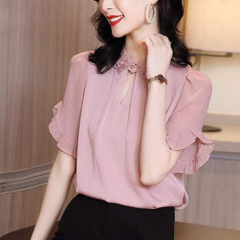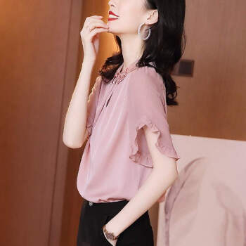 摩纤衬衫雪纺衫女仿 真丝2020夏季新款时尚气质纯色显瘦五分袖衬衫 粉色 S【建议95斤以内】