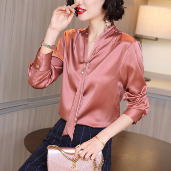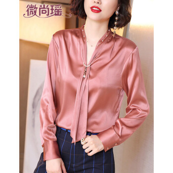 微尚瑶衬衫女2020秋季新款韩版气质减龄立领系带纽扣上衣女百搭休闲纯色V领衬衣女6976 粉色 请拍正确尺码