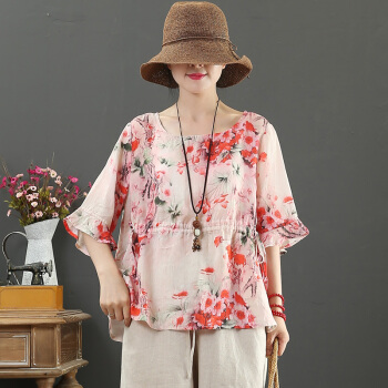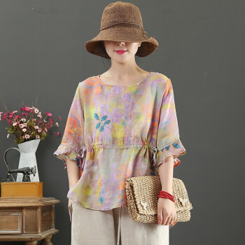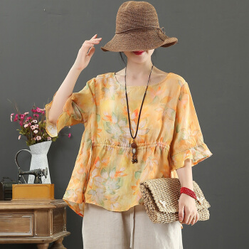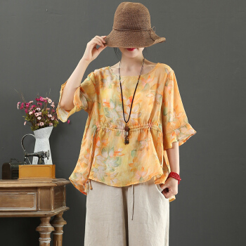 龙芝美 短袖衬衫女2020夏季新款棉麻女装文艺印花荷叶袖五分袖短款衬衣 L1-XJMC038-7133-黄色 L |