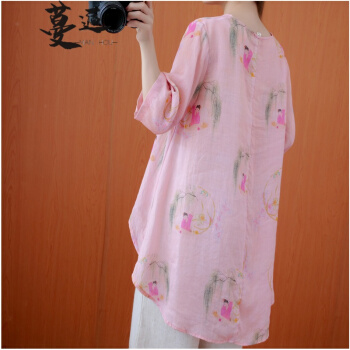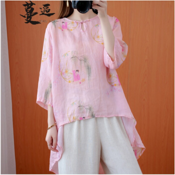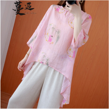 衬衫>>蔓逅 棉麻衬衫女民族风2020夏季新款文艺复古大码女装宽松显瘦中长款不规则遮肚减龄中国风印花小衫上衣 图片色 大码L【建议100-140斤】
