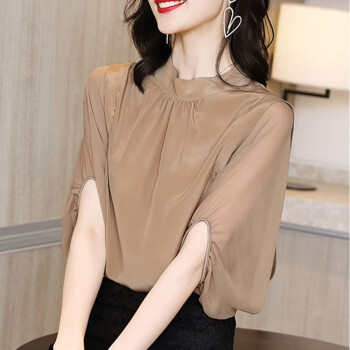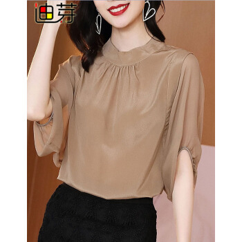 迪芽衬衫女2020秋季新品时尚韩版ins潮流纯色上衣宽松显瘦短袖圆领套头妈妈装8255 咖啡色 请拍正确尺码