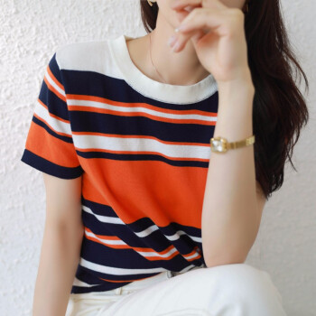 凝拉短袖T恤女纯棉2020夏季新款女装上衣韩版时尚气质宽松大码显瘦圆领拼色条纹针织打底小衫 条纹 2XL(建议130-145斤) |