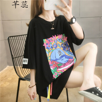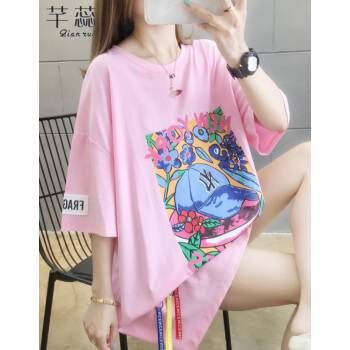 芊蕊短袖t恤女2020新款时尚韩版印花圆领中长款宽松大码女装胖MM半袖打底上衣服ins潮 粉红色 M