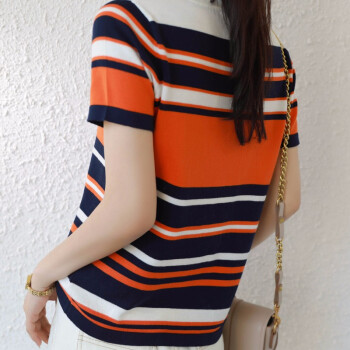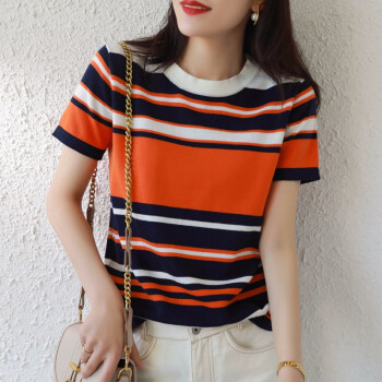 凝拉短袖T恤女纯棉2020夏季新款女装上衣韩版时尚气质宽松大码显瘦圆领拼色条纹针织打底小衫 条纹 2XL(建议130-145斤) |