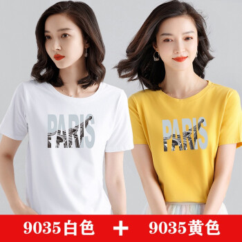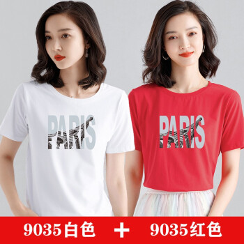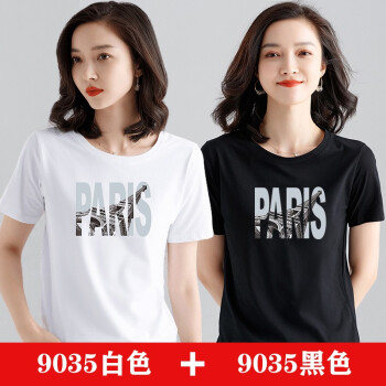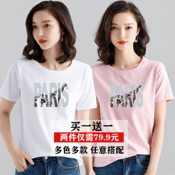 【两件装】知语者女装短袖t恤女宽松体恤大码显瘦上衣2020夏季新款百搭韩版印花时尚纯色棉质打底T恤女 9035白色+9048粉色 L《105-115斤》 |