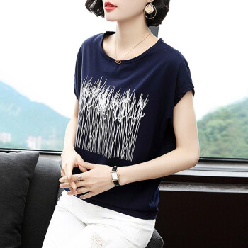 短袖T恤>>【精选好货】晞薇短袖t恤女2020新款夏装纯棉上衣宽松舒适印花上衣衫半袖小衫中年妈妈女士体桖夏 深蓝色 M
