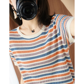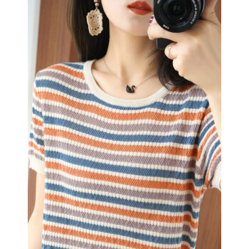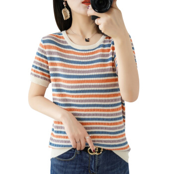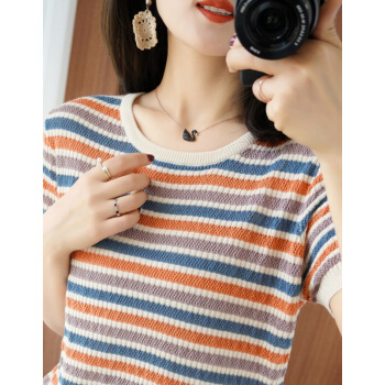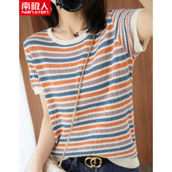 南极人 短袖t恤女装夏季2020年新款气质韩版时尚条纹撞色拼接针织小衫上衣女 条纹 M