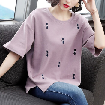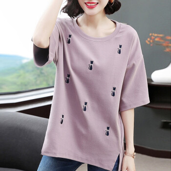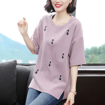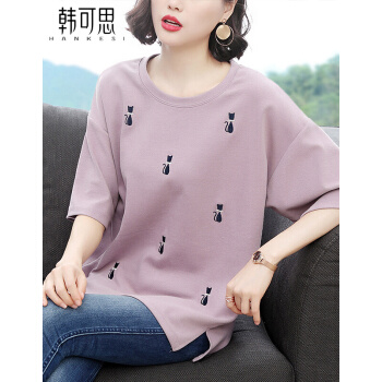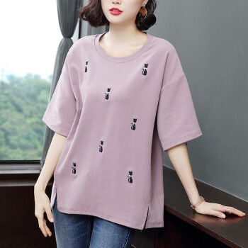 短袖T恤>>【精选好货】韩可思2020夏装新款大码女装宽松短袖t恤女小衫棉胖mm遮肚妈妈上衣衫中长款立体刺绣百搭 紫色 请拍正确尺码