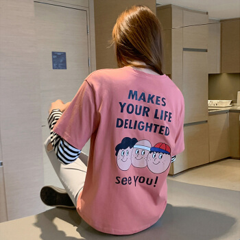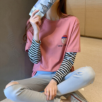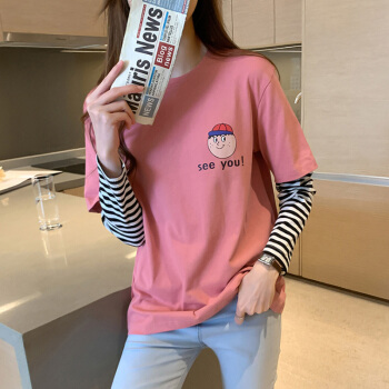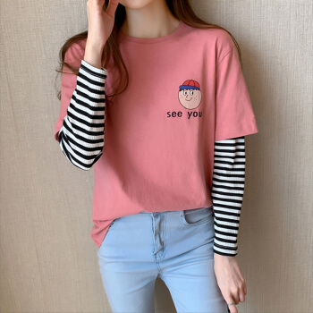 纯棉长袖t恤女2020春秋新款韩版学生百搭宽松上衣打底衫 7059粉 S 65-70斤