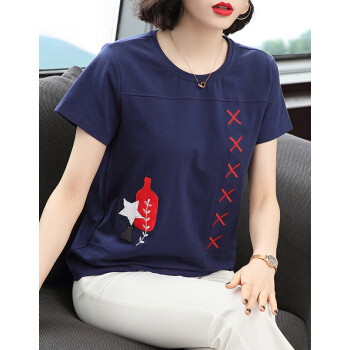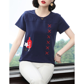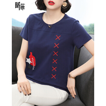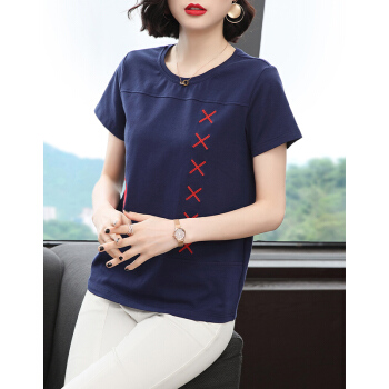 短袖T恤>>【精选好货】晞薇妈妈夏装小衫T恤短袖女2020新款中年妇女大码女装显瘦遮肚体桖棉宽松休闲上衣女 深蓝色 请拍正确尺码