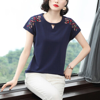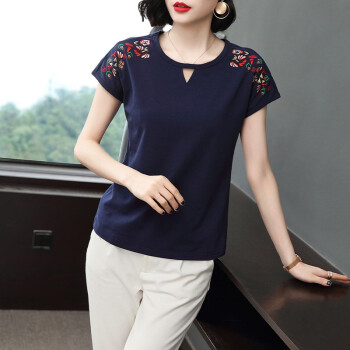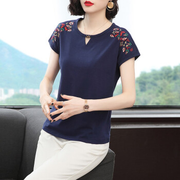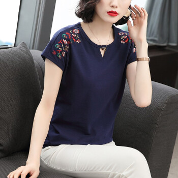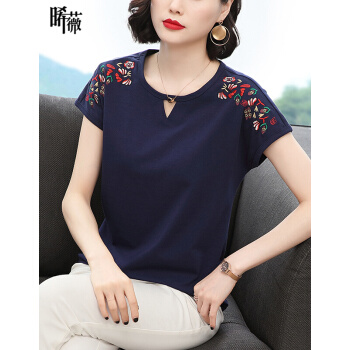 【精选好货】晞薇棉短袖t恤女2020新款夏季时尚显瘦碎花半袖上衣宽松刺绣中年妈妈女装t桖 深蓝色 请拍正确尺码