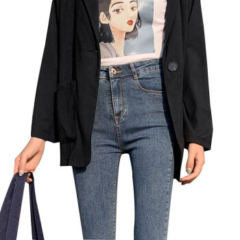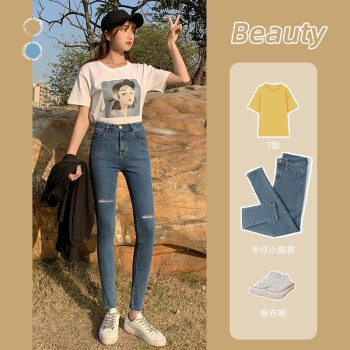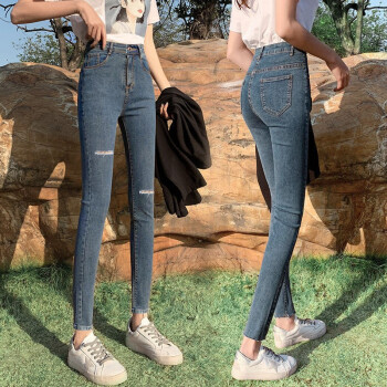 得听牛仔裤女2020年秋季新款韩版修身弹力显瘦显高春秋季黑色紧身九分小脚破洞高腰牛仔裤 (常规款)复古蓝 27(86-95斤)