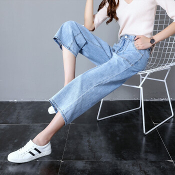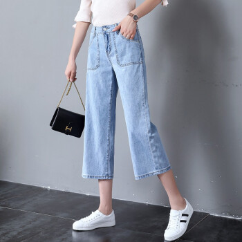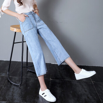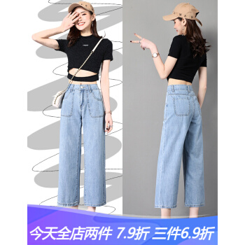 牛仔裤>>沫澜仟衣阔腿牛仔裤女2020夏季薄款高腰显瘦直筒垂感宽松休闲九分裤女时尚百搭八分裤子女 浅蓝八分 25码