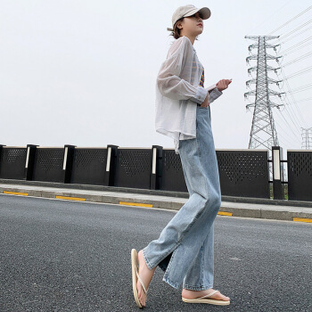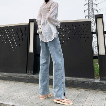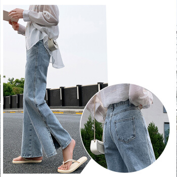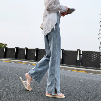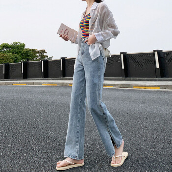 开叉阔腿牛仔裤女直筒宽松泫雅风高腰2020夏季薄款垂感拖地裤 蓝色 XXS