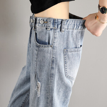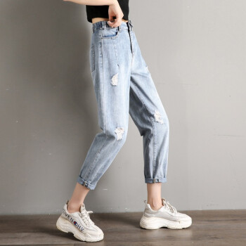 破洞牛仔裤女宽松直筒2020年春夏季新款韩版高腰显瘦百搭老爹裤休闲松紧腰哈伦萝卜裤子 919浅蓝(破洞) M码 |