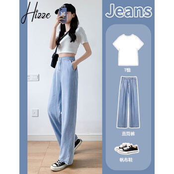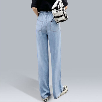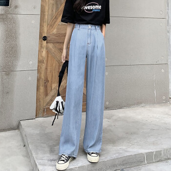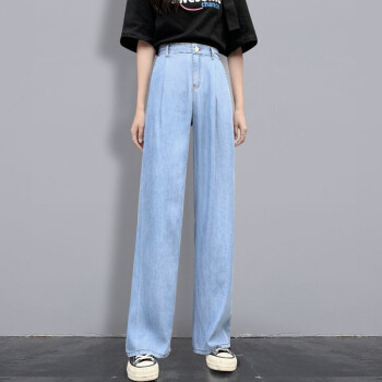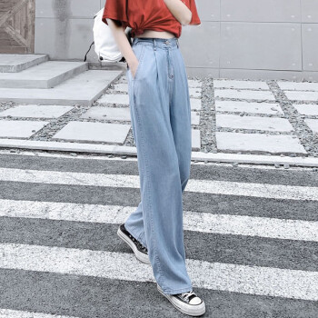 牛仔裤>>【精选女裤】Hizze天丝牛仔阔腿裤女裤子2020夏季新款薄款宽松百搭直筒高腰垂感冰丝超薄夏天长裤 复古蓝【拖地裤】 请拍正确尺码