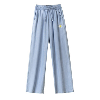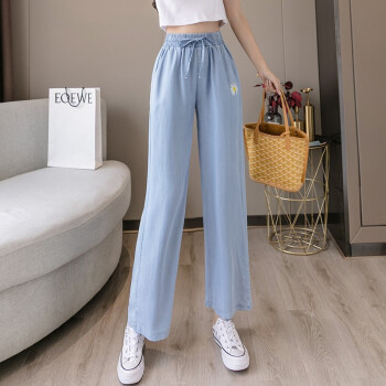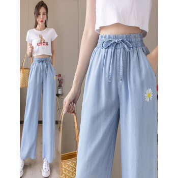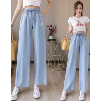 阅樱牛仔裤女冰丝 2020新款女裤夏松紧腰宽松大码休闲牛仔裤女垂感阔腿裤显瘦天丝裤子女薄款拖地裤子女 蓝色 L