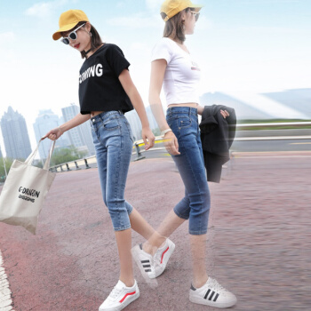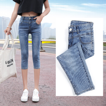 P.E.K.D 2020新款夏季七分牛仔裤女薄款宽松韩版7分裤女弹力修身显瘦中裤 深蓝 28