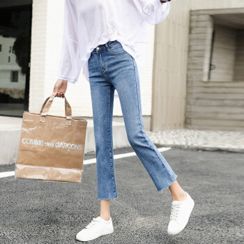 牛仔裤>>P.E.K.D 2020夏季九分牛仔裤女直筒宽松弹力网红韩版显瘦毛边小个子八分裤 蓝色-九分裤 28