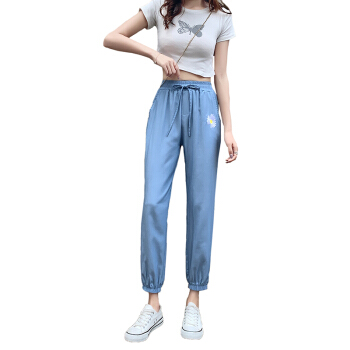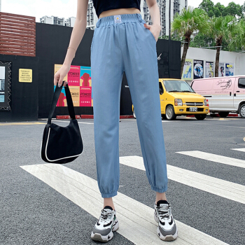 五个橘子牛仔裤女冰丝 2020新款女裤夏薄韩版宽松大码学生小雏菊九分裤女束脚裤高腰天丝休闲哈伦裤垮裤 无抽绳 L