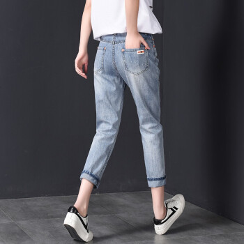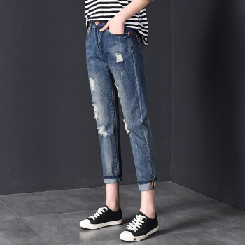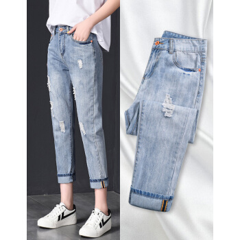 牛仔裤>>【2件特价】右昀 破洞牛仔裤女装九分裤宽松潮烂夏季薄款2020新款高腰显瘦春秋老爹乞丐裤子 浅蓝(正常腰) 28【适合106-110斤】