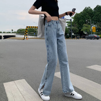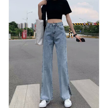 丝克诺依 牛仔裤女阔腿裤夏季薄款2020新款浅色开叉直筒宽松泫雅风高腰垂感拖地裤潮 浅蓝长裤 M