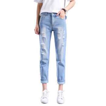 【2件特价】右昀 高腰破洞牛仔裤女宽松春秋2020新款显瘦百搭学生九分哈伦萝卜裤子 浅蓝色 28【适合100-110斤】