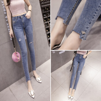 牛仔裤>>miss nitaly 女士破洞紧身牛仔裤夏季2020新款韩版女高腰显瘦显高铅笔裤修身百搭小脚九分裤 蓝色 M98-110斤