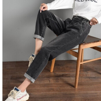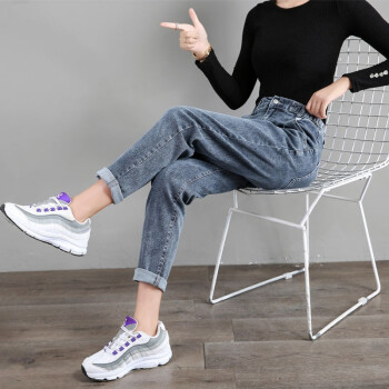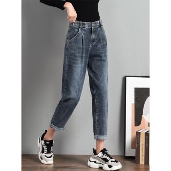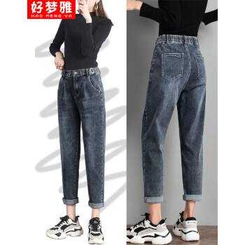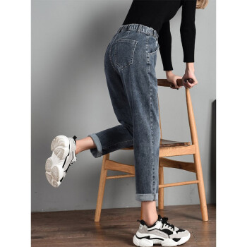 牛仔裤>>【2件特价】好梦雅 烟灰色老爹牛仔裤女宽松春秋2020年新款韩版显瘦松紧高腰哈伦萝卜裤子 228款【蓝灰色】 28 【建议105斤-115斤】