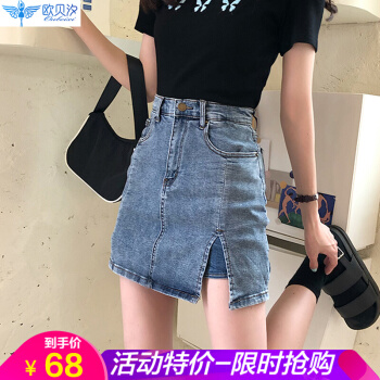 欧贝汐牛仔裙半身包臀裙夏季2020学生高腰短裙开叉半身裙裤女士裙子 蓝色 S