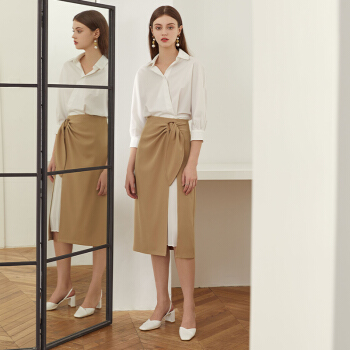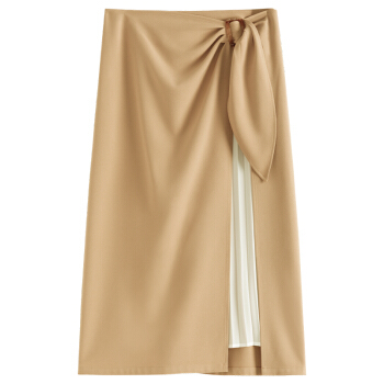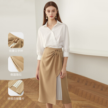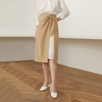 范思蓝恩 2020夏季新款不规则半身裙气质百褶裙女中长款高腰a字裙 驼色 M