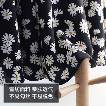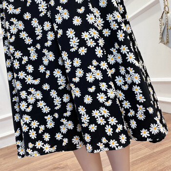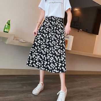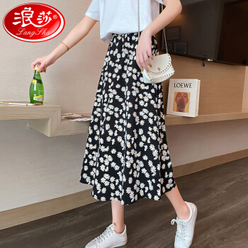 浪莎半身裙女夏季高腰碎花长裙a字中长款黑色显瘦雪纺小雏菊短裙 黑色-半身裙 L(建议85-120斤)