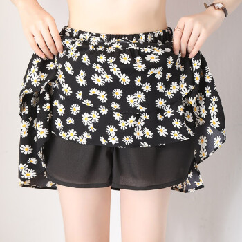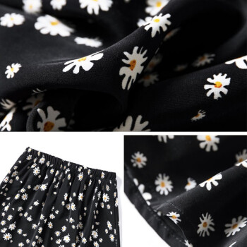 浪莎裙子女 女夏季高腰半身裙碎花中裙a字中长款黑色显瘦雪纺小雏菊短裙 短裙 L建议85-120斤