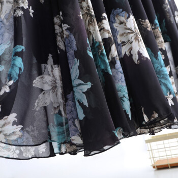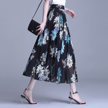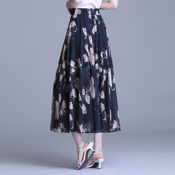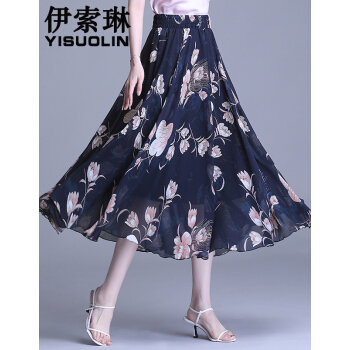 伊索琳碎花裙半身裙中长裙女夏2020新款高腰印花中长款垂感雪纺半身裙 蓝底红花 均码 80-140斤