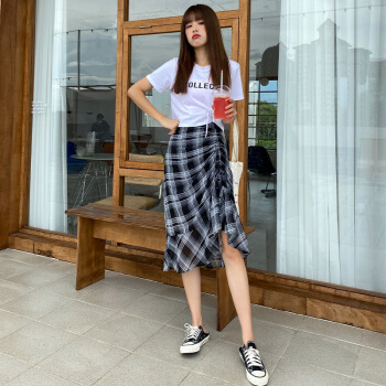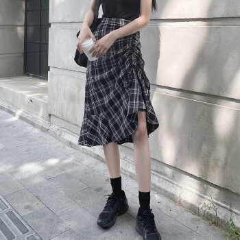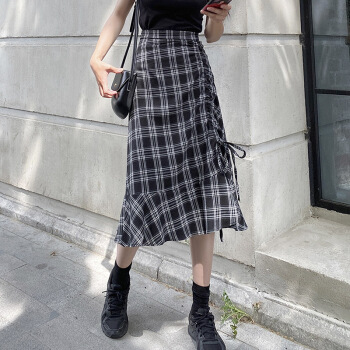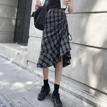 三裳高腰格子半身裙夏抽绳褶皱不规则a字裙显瘦一步包臀裙鱼尾裙中长 格子(棉麻) S