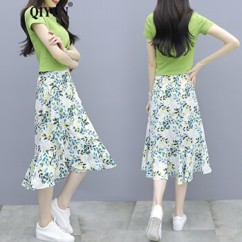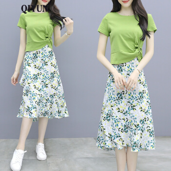 QIYUN品牌女装 时尚套装裙女小个子洋气减龄2020夏装新款女雪纺碎花半身裙两件套 翠绿色 M |