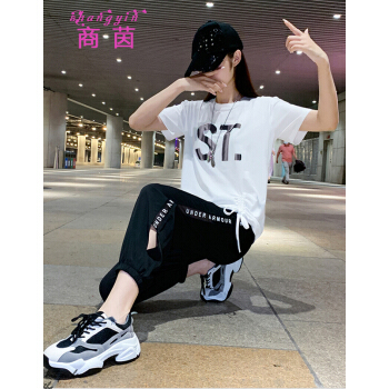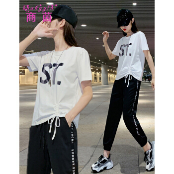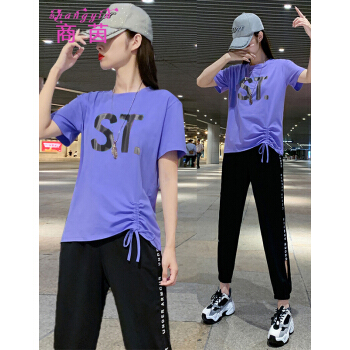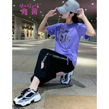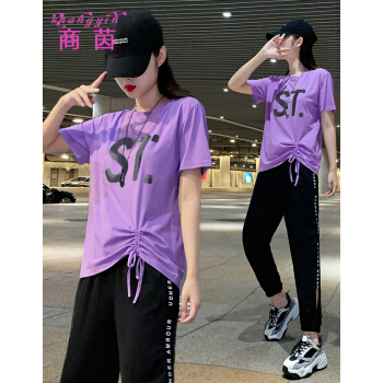 商茵SY休闲运动套装女休闲裤女夏2020新款韩版时尚休闲服纯棉宽松大码显瘦时尚减龄两件套潮 紫色套装 M(建议85-100斤)