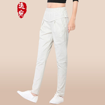 休闲裤>>逸宛yw休闲裤女2020夏季新款棉麻裤紫显瘦百搭小脚长裤薄款大码女装宽松紧高腰休闲亚麻哈伦裤 浅棕色 M【建议100-110斤】