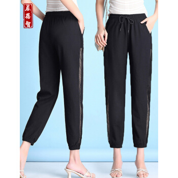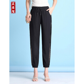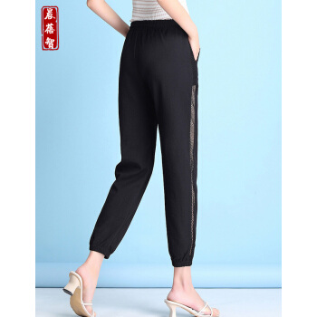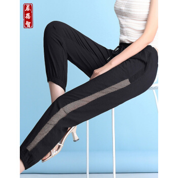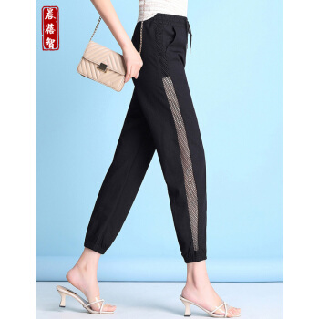 晨蓓智cbz休闲裤女2020夏季冰丝棉麻网纱拼接宽松大码女装百搭哈伦裤高腰九分运动小脚裤显瘦薄款 黑色 M【建议85-103斤】