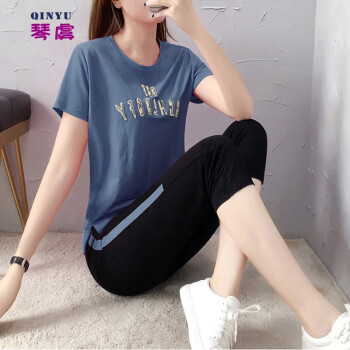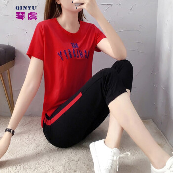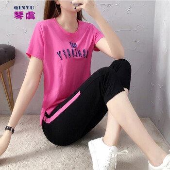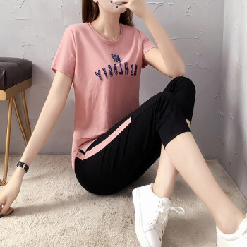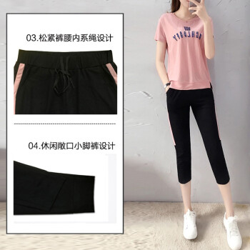 休闲裤>>琴虞QY休闲裤女休闲运动服套装女2020年夏季新款学生宽松绣花七分裤时尚短袖两件套 粉色 M【建议80-100斤左右】