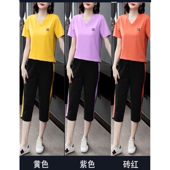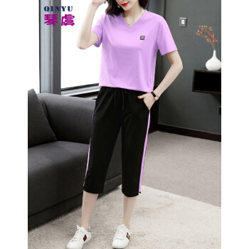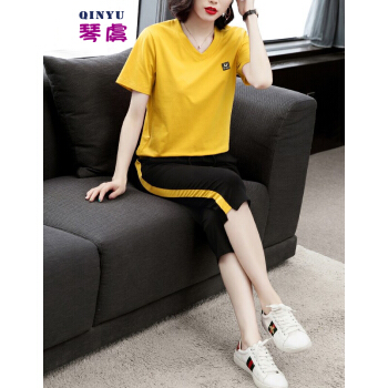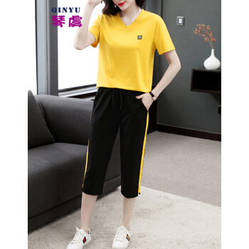 休闲裤>>琴虞QY休闲运动套装七分休闲裤套装女夏2020新款大码胖妹妹显瘦套装梨形身材穿搭显瘦遮肉时尚两件套 桔色套装 M【建议85至100斤】